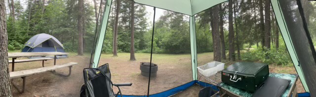 Our weather apps informed us solemnly that rain was on the horizon and we wanted to get our campsite set up before it came. Just as we were sitting down in the screen tent after getting everything up, the rain started to come down. We exchanged triumphant looks, but we triumphed too soon. We discovered something interesting now about our new screen tent. It kept out the insect riff raff, but not the rain, sadly. It has a canopy at the top so we moved our chairs toward the middle in the hopes of staying dry. Hope got soaking wet, so we abandoned ship and retreated to the tent where the tent fly kept the inside nice and dry. We stayed in our little ark for awhile, reclining and reading on our cots – not a bad way to spend the afternoon, actually. By the time suppertime came around, the skies were relatively clear and our excellent chef got to work. He also does the dishes while we’re camping, so I can’t recommend him highly enough. Sadly for you, he’s taken.