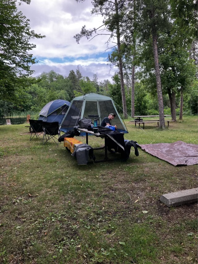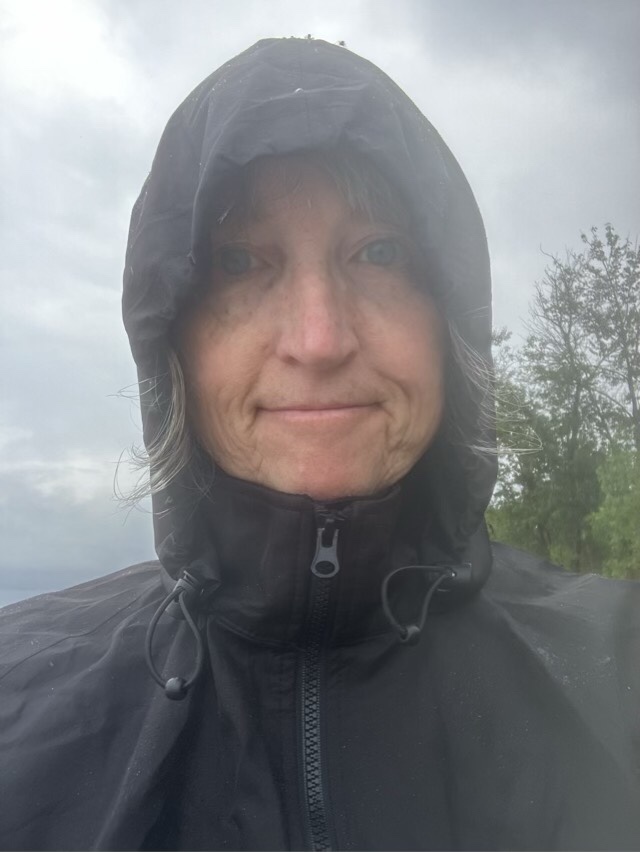 As I said before, we had to pack up our stuff in the rain when we left Hayes Lake State Park. Those of you who have done this know what I’m talking about. It’s not the ideal way to break down camp, but needs must. (That’s the way they used to say things in the 1800’s – quaint, isn’t it?). With our soggy belongings tucked into the car and the car-top carrier, we drove up to Warroad to wait out the rain, not wanting to do the next hike at Zippel Bay State Park until it stopped raining. The weather app kept promising times when the rain system would be past us FOR SURE, but the weather system itself proved that things aren’t always that predictable. After some hot drinks and some reading downtime, we decided to go to ZBSP and take our chances.