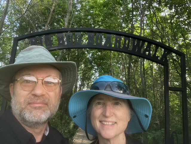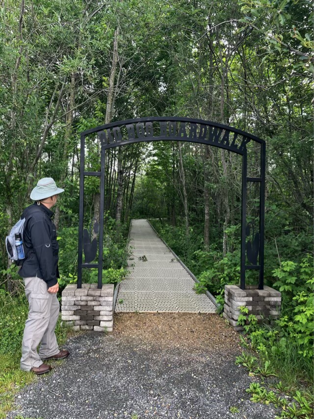 We packed up early the next morning, having decided to do the 2-mile Big Bog hike before breakfast. Yes, even before Kris’s early morning coffee! The bog portion of the SRA is in the northern unit, which was about 15 miles north of us, so it was 7:55 a.m. by the time we started out. It was 68 degrees – not too hot – but boy, was it close and sticky! In order to get to the bog walk, you have to do a short jaunt part-way around Ludlow Pond until you see the grand entrance to the bog.