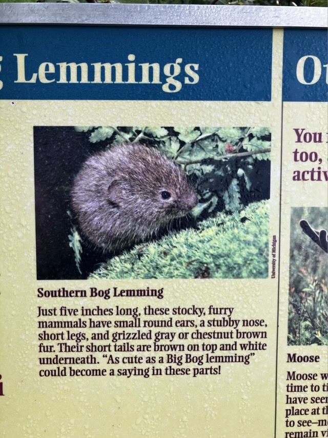 Animals that inhabit the bog range from the terrifyingly large moose (which we didn’t see, thank God) down to the adorably cute little bog lemming. I’m really taken with the whole idea of bog lemmings. If I had the artistic skills of Beatrix Potter, I would start a book series featuring these.