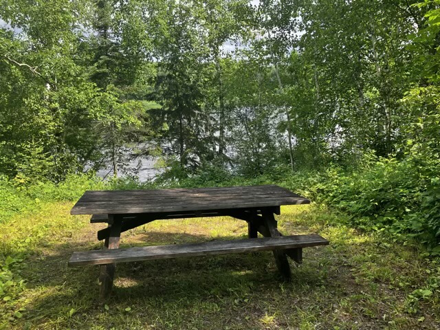 When we got to the place where we’d be turning around, there was a nice picnic table to take a moment’s rest. We were uphill from the river and there was no good way to get down there, so we didn’t.