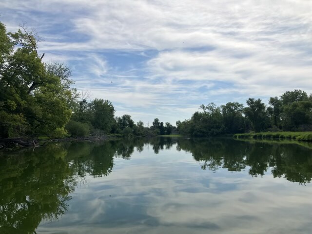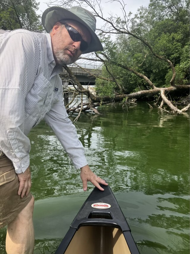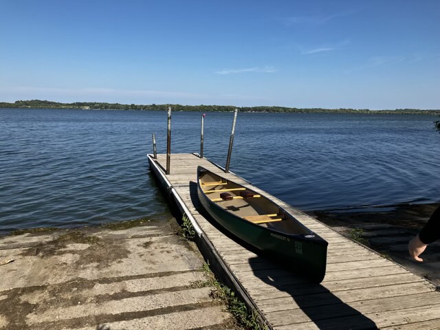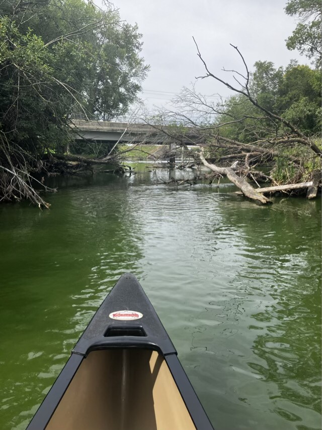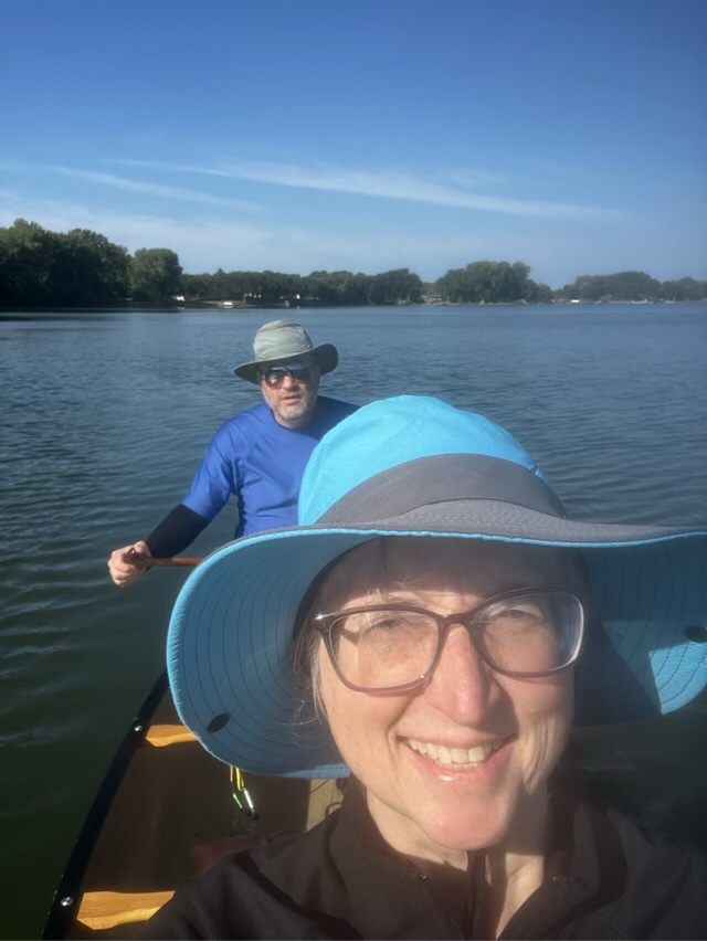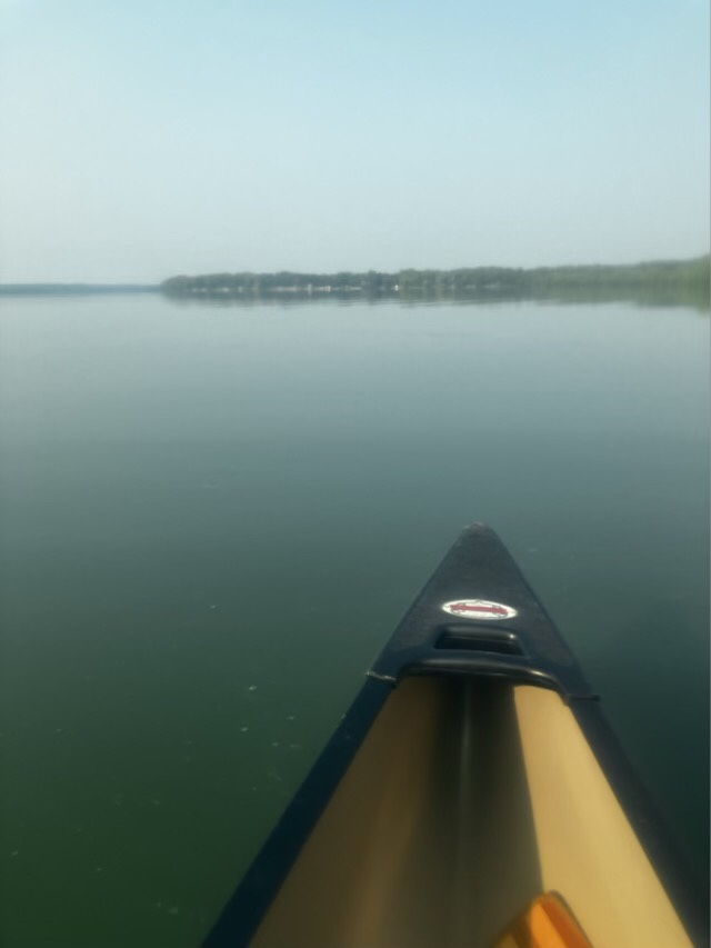 We’ve been out in the canoe a few times in the last month, finally exploring local lakes and rivers. Our first voyage was through shallow channels that in less droughty conditions would constitute a river. Our paddles frequently met with the sandy bottom. I saw some odd little logs that turned out to be a friendly group of disgusting carp. Each time we came around a bend, we startled some contingent of wildlife – deer, lots of egrets and herons, a few ducks and even an otter (which I never saw – I’m taking Kris’s word for it). Many, many times I wished I could have brought my big camera with the zoom lens along, but it’s too risky. We keep our phones in a waterproof bag so it’s not always easy to get photos at all. At one point, the river got so shallow that Kris had to get out and pull us along. Visions of “The African Queen” danced through my head, but I made sure the leeches from that scene weren’t dancing in there, too. Toward the end, I had to get out and help pull, which ruined my sense of being carried along like royalty.