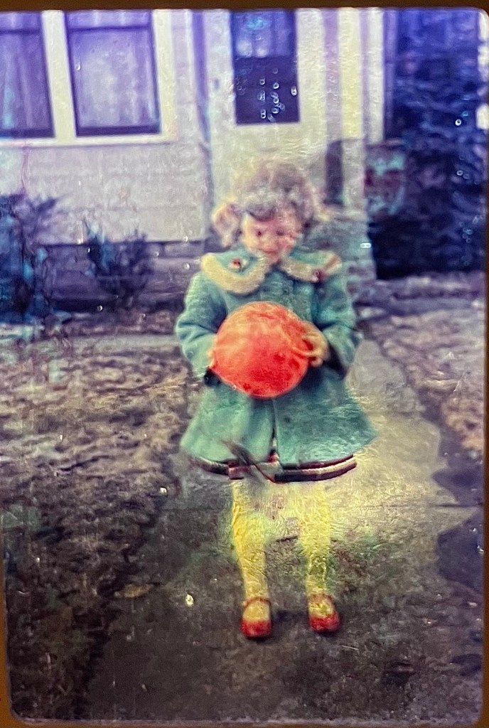 Little Girl Holding A Ball. It could be the title of an old painting. I found this slide among my mother’s things and took a photo of it with light shining from the background. It’s a cheap way to make a photo from a slide, but I don’t necessarily recommend it.