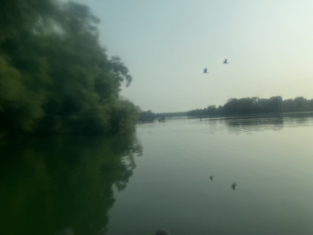 Our second time out, we explored a lake instead. After going under a bridge, we came to a tree-covered island that turned out to be a roosting place for hundreds of large waterfowl. Very cool. We discovered that we could keep our cameras in sandwich bags and take photos right through the bag. Since our sandwich bags were green, this lent an interesting filmy look to the photos which I rather liked.