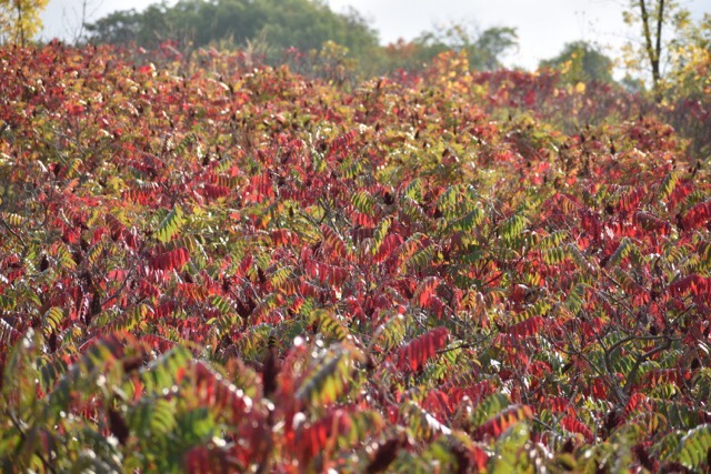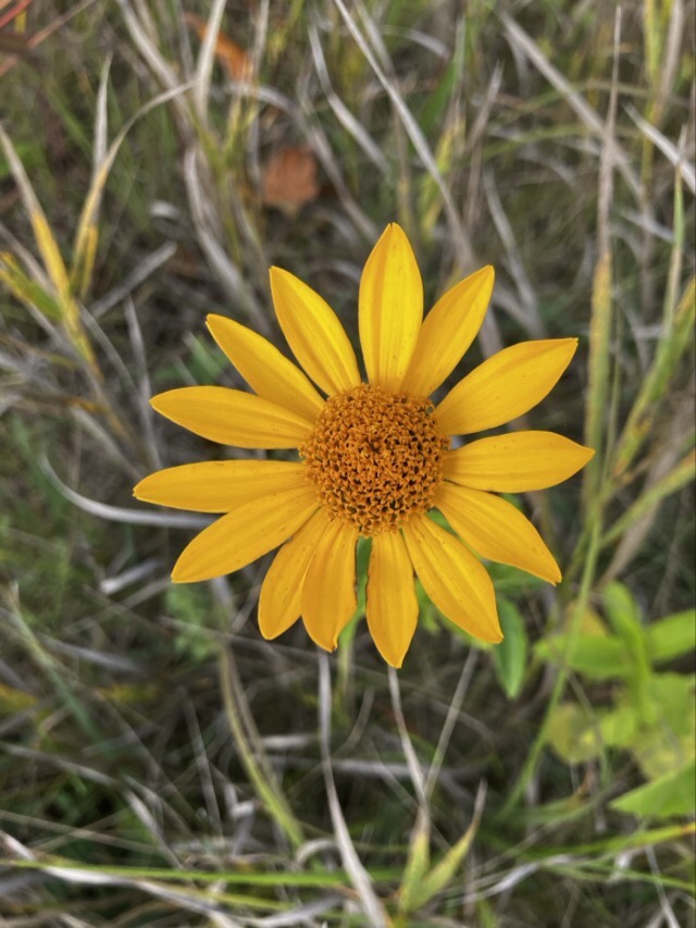 We noticed a few more blue asters here and there, still straggling along when most of the other flowers were gone. Kris decided to make up a new saying, “It ain’t over until the blue aster sheds its petals.” Of course right after that we saw some false sunflowers looking fresh and new on the scene, giving the blue asters a run for their money. That’s really the name of the flower, too. How would you like to be known as a false something? It’s also known as “oxeye sunflower,” or even more academically, as heliopsis helianthoides. No matter – its most common name identifies it as what it is not. That’s the way it goes.