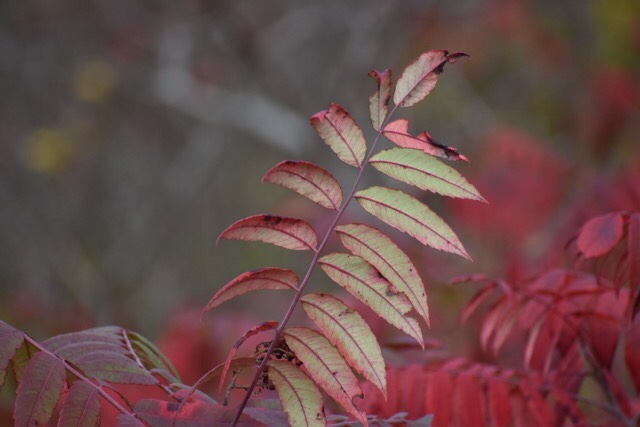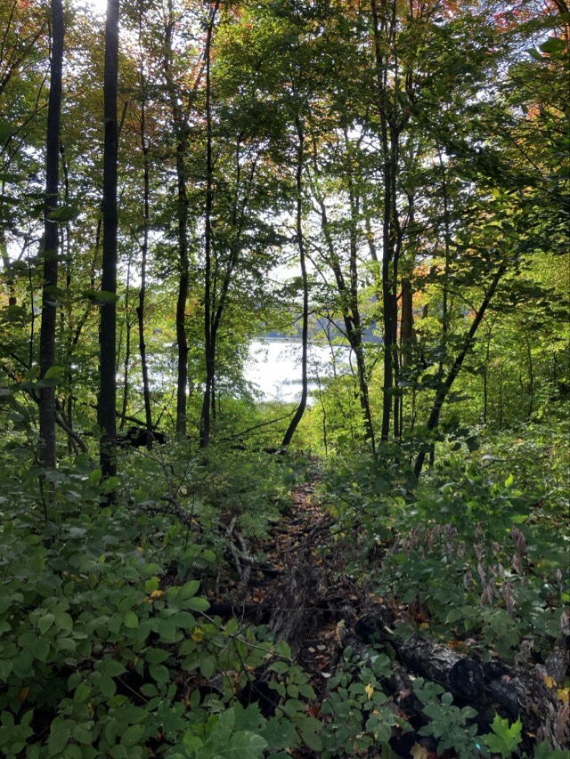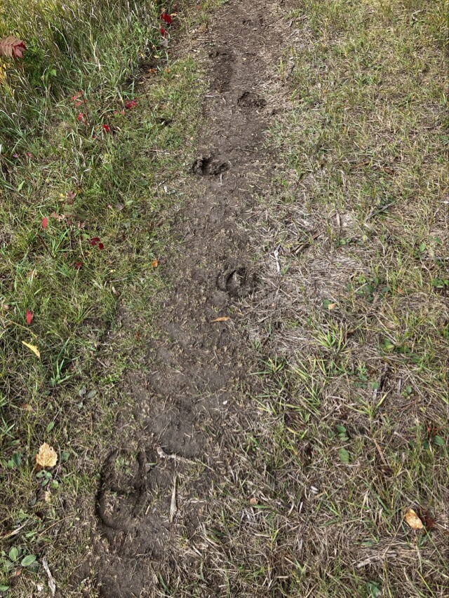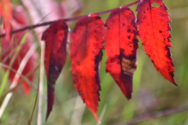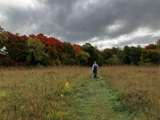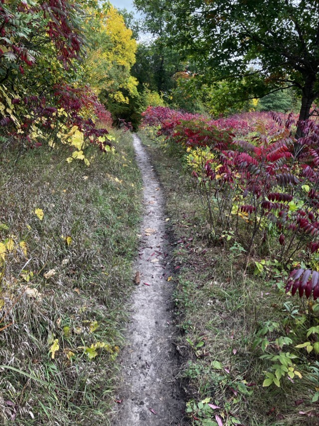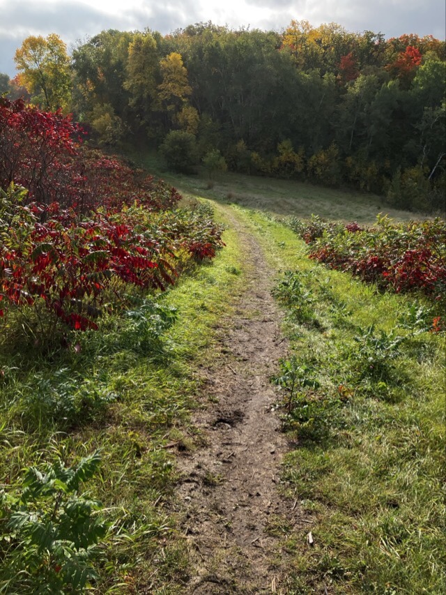 Right from the get-go, the trail south was hilly, taking us up and down through the autumny forested area. The sumac was at its height of glory all through the park. We saw horse tracks, a sign of things to come. It wasn’t long before we were traipsing through an area with small lakes on either side of us: Cataract Lake on the right (I think) and farther up, Grass Lake on the left.