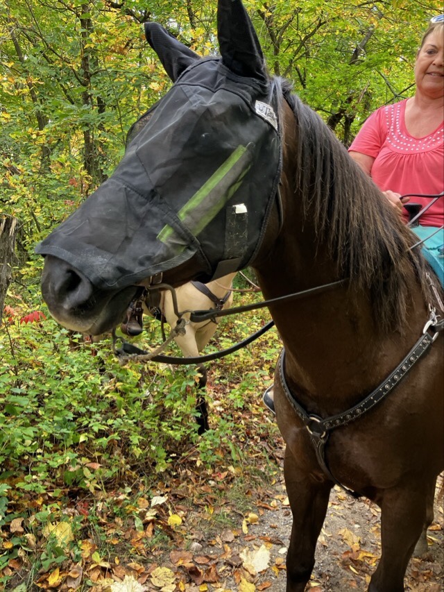 For a nice change of scenery, a few horseback riders came ambling toward us. They stopped abruptly in the trail as if waiting for us to go by. When we approached, one of the women told us that her horse had heard the sound of my hiking poles and seemed to be a little uneasy. She asked if I’d be willing to let him smell them. Of course! I’m always willing to help a horse in need of hiking pole acclimation. In return, I asked if I could take a photo of her handsome horse. It was a fair trade, don’t you think? He had netting over his face that his rider said was to keep him from getting annoyed by bugs. The other two horses went without the bug screens and were no doubt silently mocking their pampered friend.