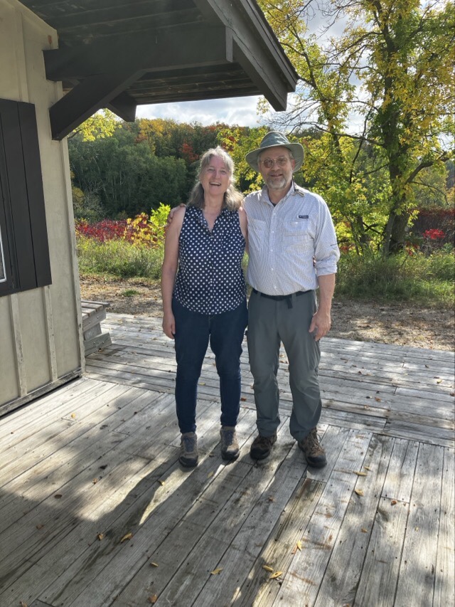 At the end of our first hike, our son Sam was with us and took a photo so we didn’t have to rely on doing a selfie. I really wanted to have someone take a photo of us at the end of our last one and had even worn the same shirt as on our first hike to lend a pleasing symmetry to the experience. When we got back to the lot, we found someone willing to record this auspicious occasion.