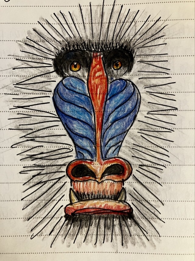 And then I got carried away and did an illustration of funny-faced mandrill, although I did not include the colorful back view.