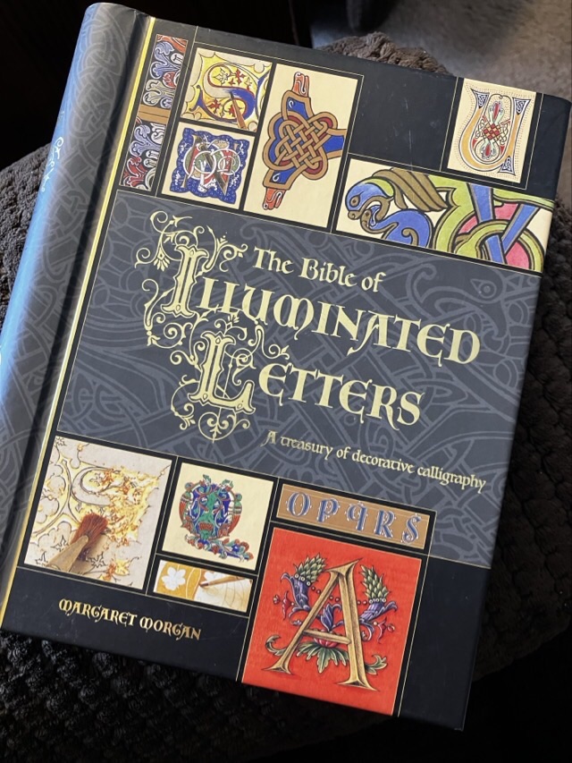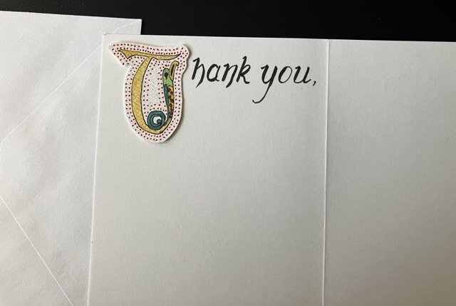 One of my sons gave me a book for Christmas called “The Bible of Illuminated Letters.” Even though the instructions call for all sorts of hoopla that I’ll probably never do (like mixing your own colors and using gold leaf), it’s a very appealing art form, so I decided to give it a try when I sent him a thank-you note.
