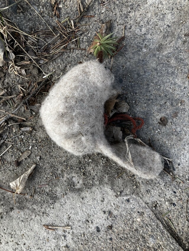 It looks like a wee ghostly beaver with its entrails coming out, but I suppose it’s probably something rather more prosaic like dryer lint. If I had been a better citizen I would have picked it up and thrown it away instead of merely taking a photo of it.