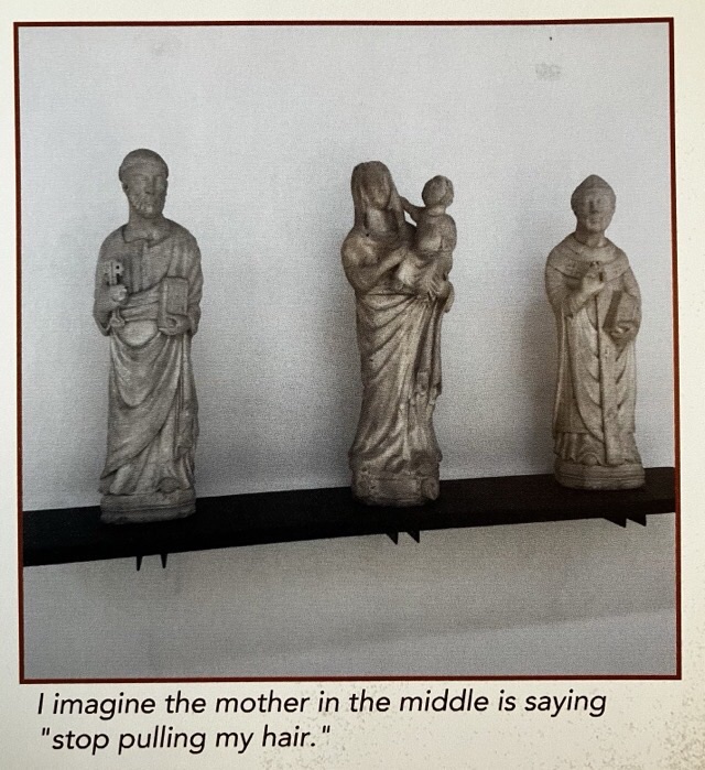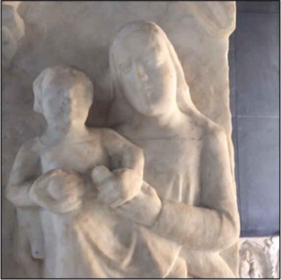 The place contained a lot of recovered fragments of architecture and pottery from hundreds of years ago, and as we went up and around, a lot of statues and then paintings, also recovered from various sites. We must have seen dozens of “Madonna Con Bambino” sculptures and paintings, apparently a very popular subject. In many of them, the baby Jesus was holding some sort of sphere; sometimes Mary had one too. What was the significance of that? We couldn’t figure it out.