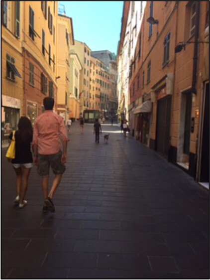 By 11:30 we were ready to explore Genova and had studied carefully the map that Giovanni had given us the day before with his notes and circled items on it. Like Christopher Columbus so many years ago, we were going to explore the unknown (to us) and expand our horizons. Some of the narrow streets are pedestrian only, lined with smooth bricks, and were already populated by many people out for a stroll.