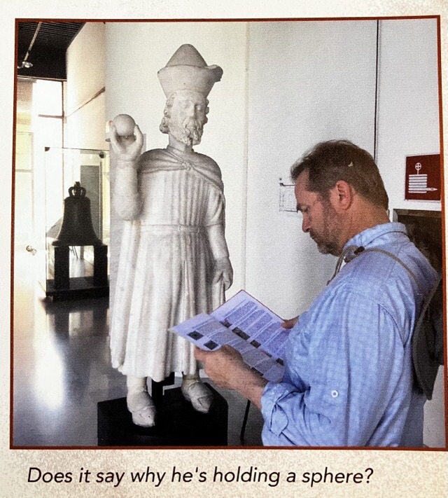 We went up the narrow stairs and found two small rooms, one of which was roped off and held a table set for a long-ago dinner and the other was empty except for a small video display on a wall and a stone relief sculpture of one of the famous 3 ships on another wall. I watched the 5-minute video in the hopes that I’d understand some of it, but unless you count understanding one word of every 100 or so, it was pretty much a wash.