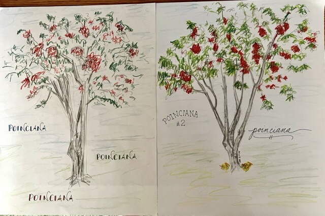 I’m still doing rough drafts of the poinciana tree and feel like I’m getting to know it better. Here’s the first and second rough drafts side by side, followed by the original photo. I drew the second one from a photograph of a different perspective, so the trunk is different.