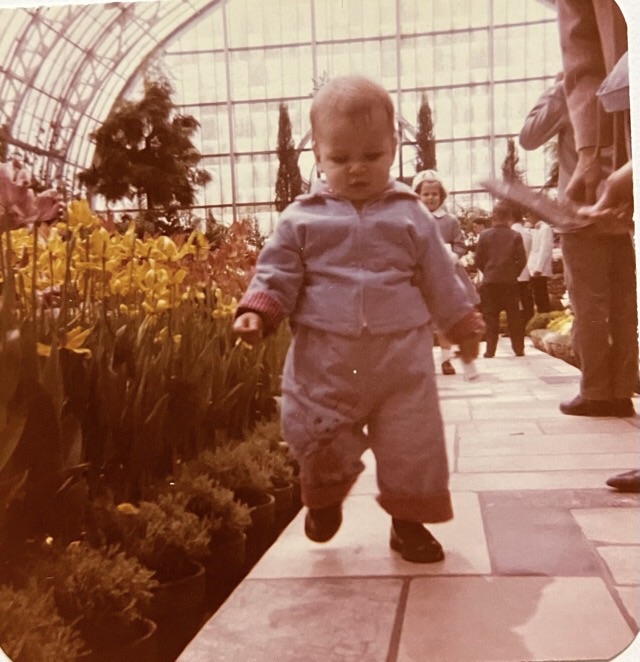 Como Park has been around for over 100 years and countless parents have brought their children there over the years. Both Kris and I remember being brought there when we were young; I couldn’t find our family photo there, but do have this charming one of little Kris wandering in the conservatory.