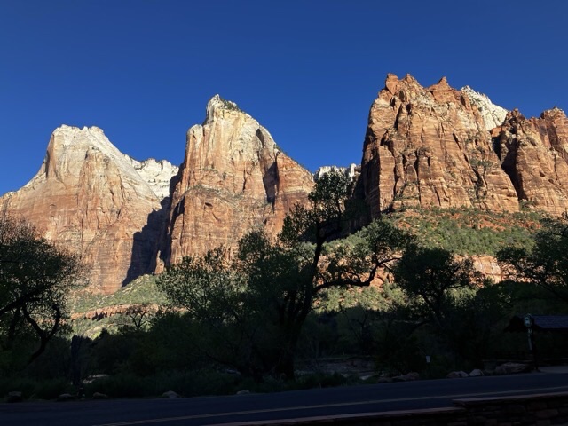 Up until now we haven’t seen huge crowds at the parks we’ve gone to, but Zion was packed. The first stop was “Court of the Patriarchs,” where very few people got off, making us wonder if we were chumps. The patriarchs are three distinct stone cliffs that a Methodist pastor named “Abraham, Isaac and Jacob,” back in the early 1900’s. The names have stuck. Photos were taken. There was a smaller formation that was named “Moroni.” The Christians won that round over the Mormons. We walked around a little bit – went down to the Virgin River, but quickly realized that there wasn’t much to see there. Chumps.