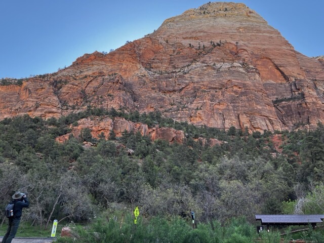 Back to the lodge, we waited for another shuttle to take us up to the Sinawava Temple area, which is the last stop on the shuttle bus tour. A shuttle bus came, passed our little group waiting for the bus and parked ahead of us. And it was nearly empty, which was a plus – but no one in the group went to go get on. One couple meandered over and got on, so we finally went over as well. Once on the bus, Kris asked why this shuttle parked so far ahead of the other bus stop – was there a difference? Yes, this one was going back down the road to the Visitor Center. We got off and went back to the other line. Chumps.