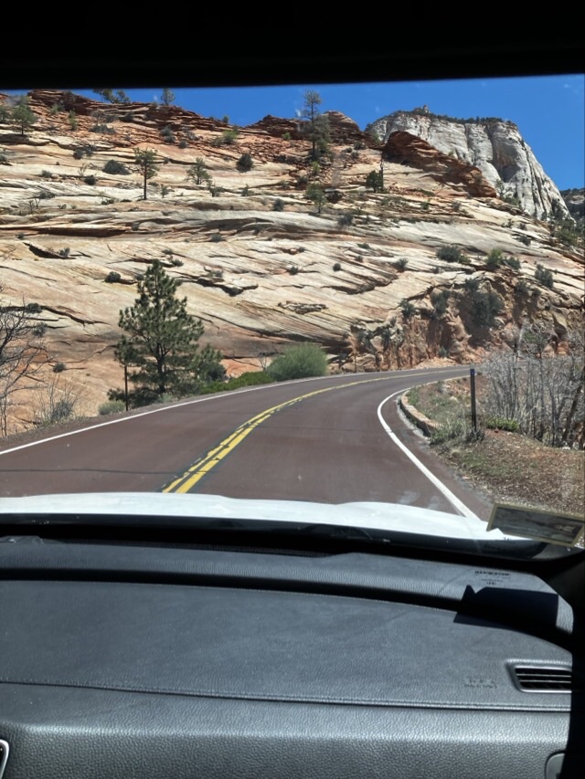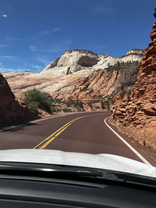 The museum was minimally interesting – little bits of information about the early inhabitants of the area: the Native Americans and the Mormans. We strolled around and got on the next shuttle to go back to the Visitor Center. Amazingly, it was noon by the time we left. From the Visitor Center we took a shuttle back to our car and ate our familiar lunch of Wheat Thins, Swiss cheese, and grapes. Kris wanted to drive the road to the east entrance through the park so we did that after we finished eating.