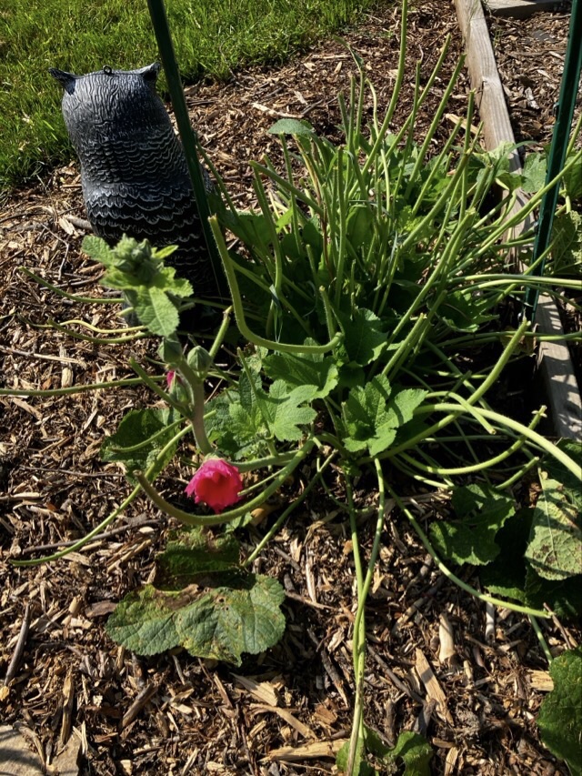 I also took the cage off of our sunflower this morning. Will it suffer the same fate as the hollyhocks tonight? I took a parting photo just in case. If we remember we’ll put some deer scram over and around it to see if that helps. If not, that’s the way the sunflower gets eaten, I guess. Next year we plan to put black-eyed Susans and purple coneflowers in that spot. We want to have the kind of garden that says to any deer that are passing by, “Keep going – there’s nothing to eat here.”