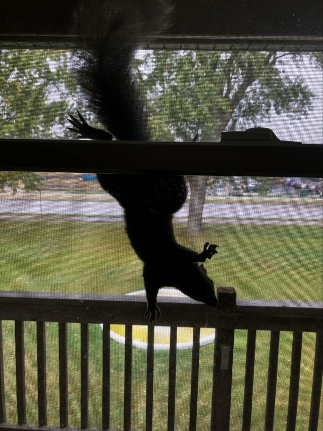The next day as I was brushing my teeth I heard a loud noise coming from the window. I lifted up the shade and to my astonishment, a squirrel was on the screen, just passing the time and not in any particular hurry to move along. I tapped the window to give her some motivation and off she went. Another visitation!