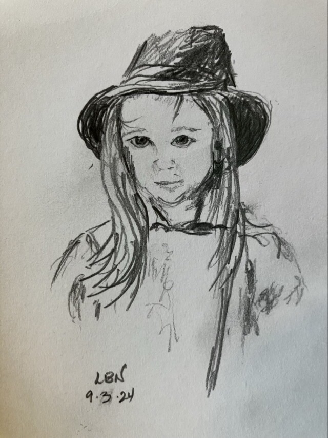 I decided this week to do a drawing experiment. I picked out a photo of granddaughter Lucy from a couple years ago and purposed to do a drawing of it every day for a few days to see if I could get any better at capturing her. Each day I spent more time looking at the photo up close, to understand the relative sizes and proportions involved, the mixture of shadows and light.