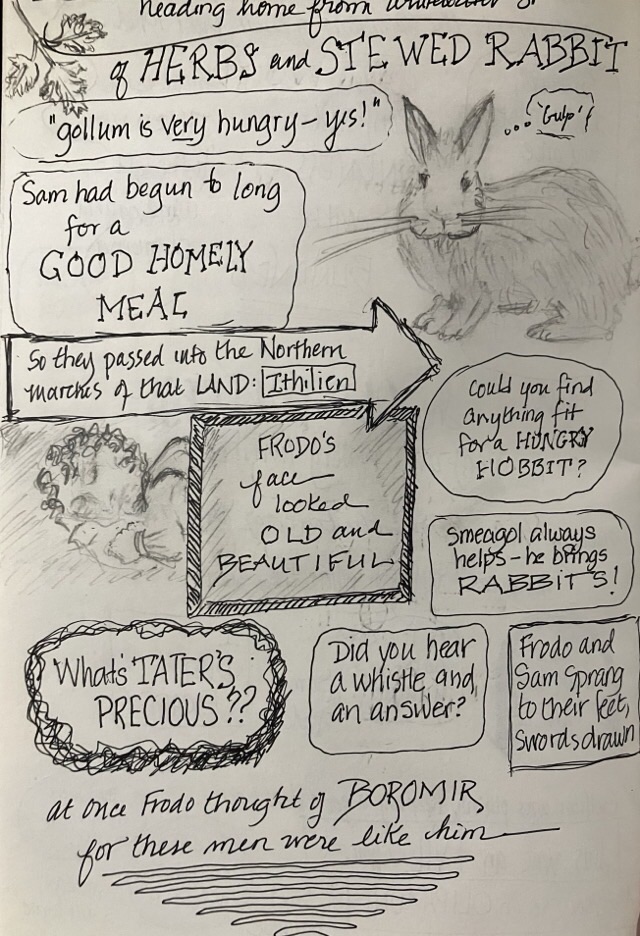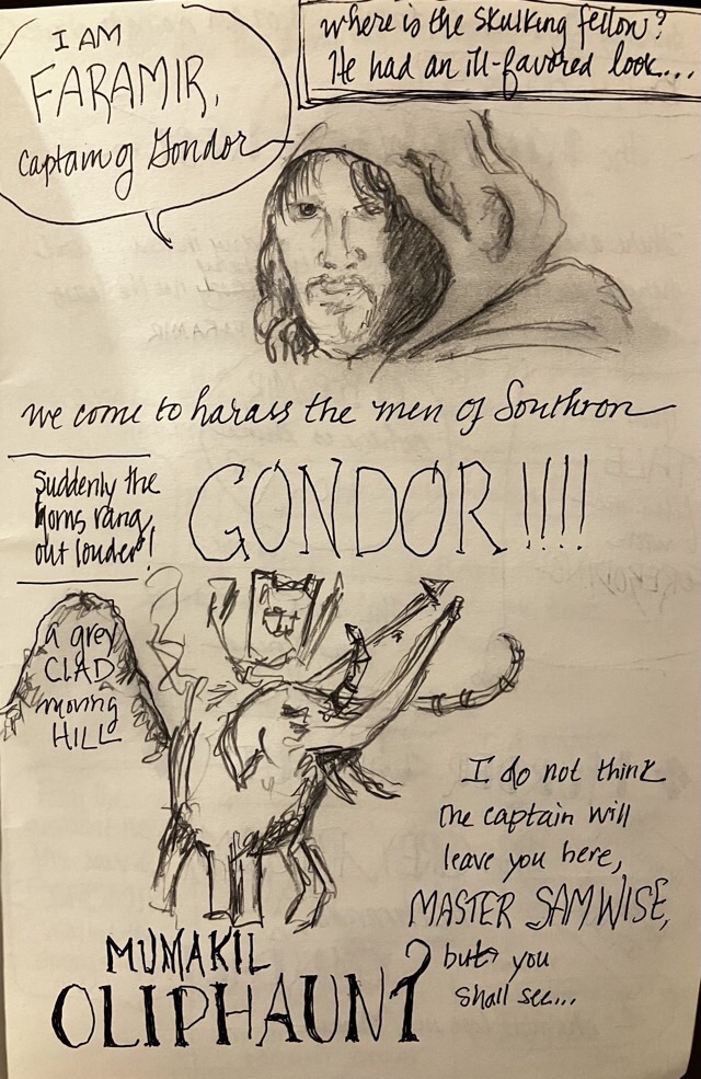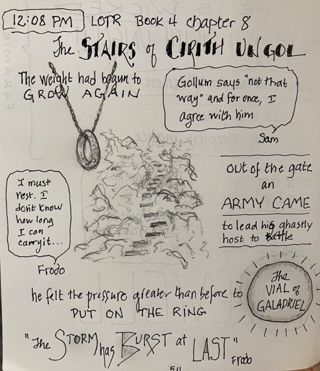 We continue to listen to the audiobook version The Lord of the Rings, wonderfully read by Andy Serkis (the actor who played Gollum). We are nearing the end of The Two Towers and I am still taking notes and make sketches as we go along. It helps me to concentrate and keep my mind from drifting, as it is wont to do. LOTR fans will perhaps enjoy the following photos of my notes. The rest of you will scratch your heads in great puzzlement over it all. Bless you, either way.