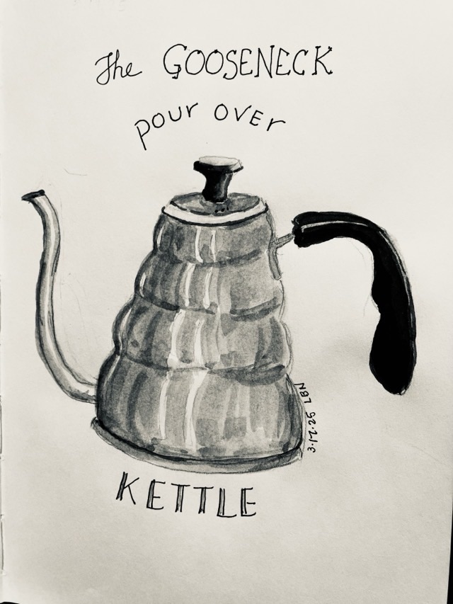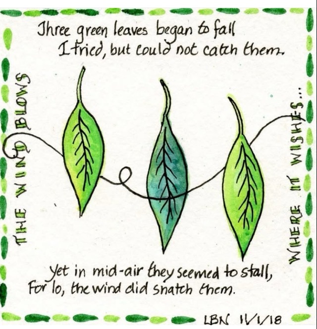 One of the artists I follow on Instagram just started a project in which she does a simple sketch and painting three days a week. The part that intrigued me was that she’s not using watercolor paper – just a little notebook. Well! That opens up all sorts of possibilities! My brother-in-law Karl gave me a beautiful little blank book made by Baron Fig. (I’ll bet Baron Fig is related to the Earl of Sandwich.) The pages are unlined and just beckoning to be used by this very kind of project. I have begun.