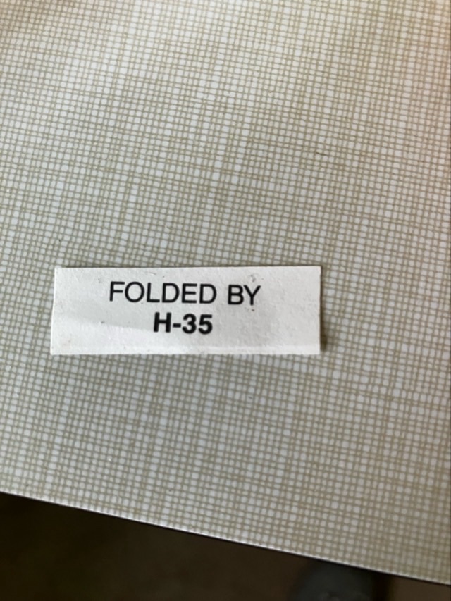 I was inspired to write this story after finding a little slip of paper in one of my mom’s old boxes that said, “Folded by H-35.”