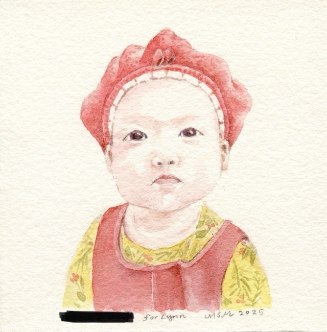 My dear friend Martha sent me a painting for my birthday a couple months ago. Tears came to my eyes when I opened the envelope and took it out. It’s our little granddaughter – it’s HER! (Martha and I share a grandchild, having had the good providence of my son marrying her daughter.) I was just blown away by this beautiful, skillful and extravagant gift.