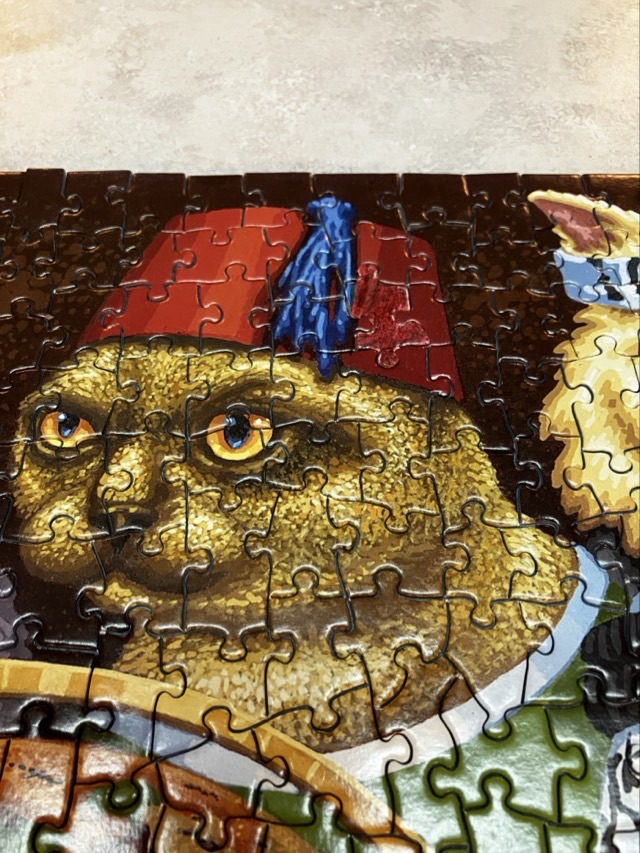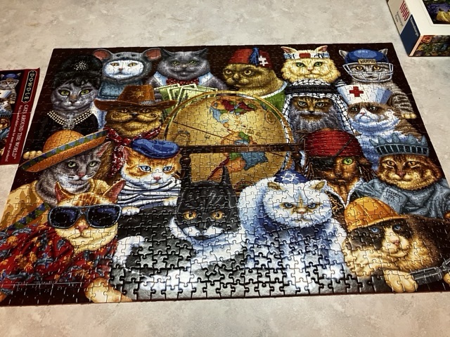 I had borrowed this from friend Lori who had notated on the box cover where the missing piece was, so it wasn’t a cruel surprise. In case you can’t see it, the missing piece is in the red hat in the cat in the middle at the top.