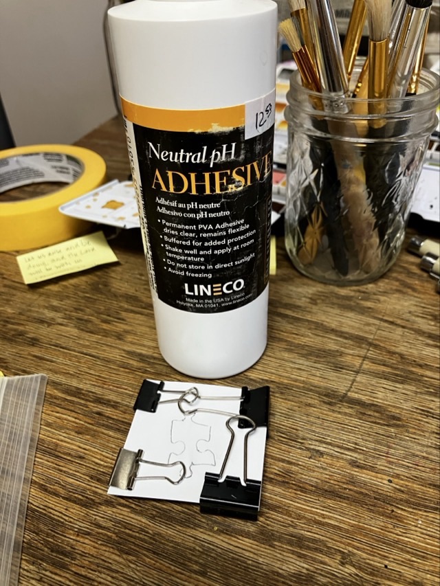 Then I glue the paper onto some cardboard that’s more or less the same size depth as the puzzle pieces:
