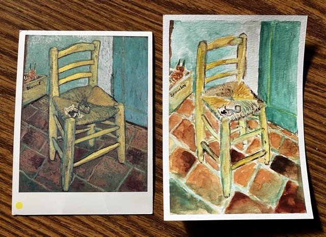 I have continued to struggle with getting proportions correct, something I’ll be working on in future paintings. I didn’t aim to get exact color matches; mine is a great deal brighter than Van Gogh’s. If you look carefully at mine, you’ll see a major change I made, putting my mark on the painting. Wink, wink.