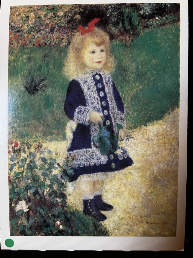 A Girl with a Watering Can was painted in 1876, an oil painting on canvas. It was apparently painted in Claude Monet’s garden, the little girl possibly a neighbor of Renoir’s. It is on exhibit at the National Gallery of Art in Washington D.C.