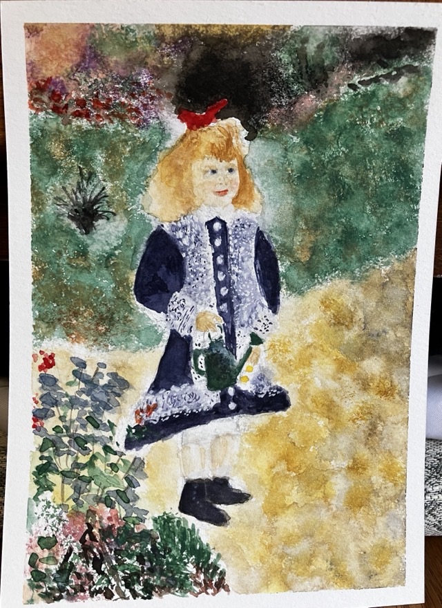 Getting the proportions right continues to elude me, but since this painting was in the impressionist style, it left me some wiggle room for interpretation. As always, it is well nigh impossible to achieve the same effect with watercolor as an oil painting (at least for me). I labored the longest on mixing just the right color blue for the girl’s dress. Couldn’t get the facial colors or her expression right, though. I ended up being fairly pleased with how the lacy part of her dress turned out (but don’t look too closely at it).